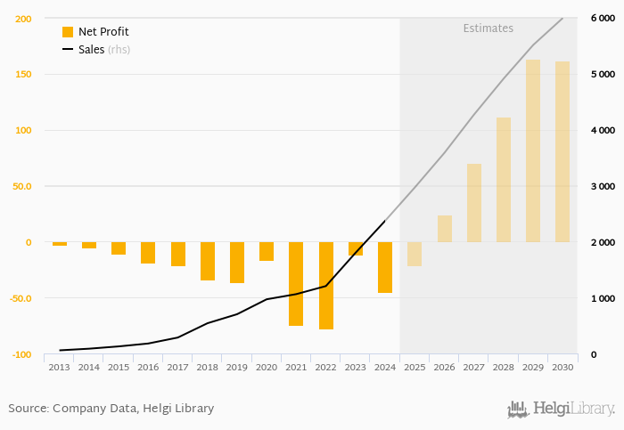 Sales have grown by 39.5% a year on average since 2014. They reached a high of EUR 2,371 mil in 2024 and a low of EUR 55.3 mil in 2013.