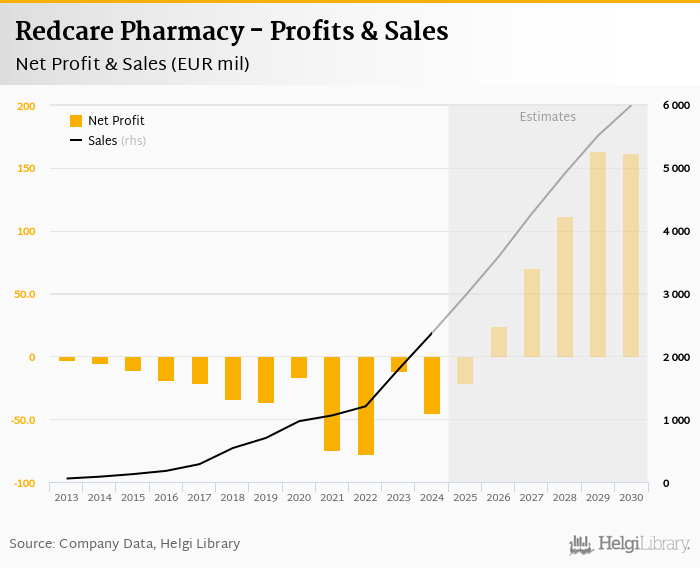 Redcare Pharmacy made a net profit of EUR -45.5 mil in 2024, down 278% compared to the previous year. Total sales reached EUR 2,371 mil, which is up 31.8% when compared to the previous year.
