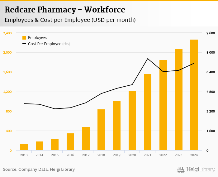 Redcare Pharmacy employed 2,266 employees in 2024, up 9.2% compared to the previous year. Historically, between 2013 and 2024, the firm's workforce hit a high of 2,266 employees in 2024 and a low of 133 employees in 2013.