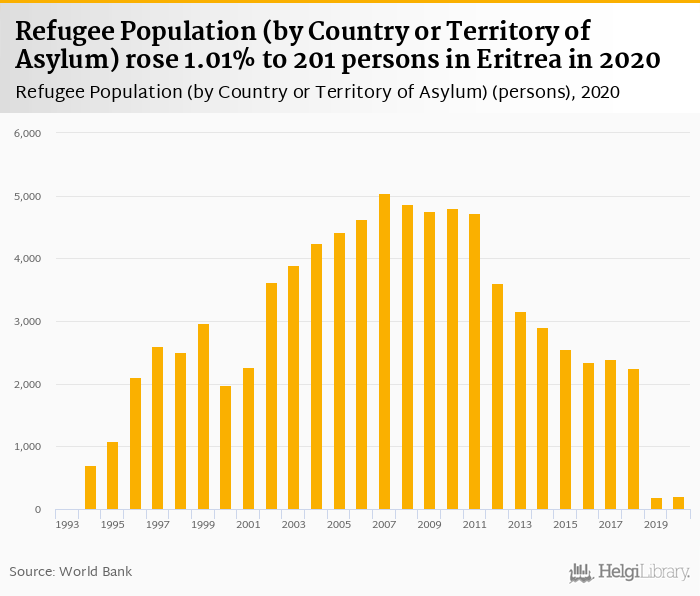 Refugee population by country or territory of asylum rose 1.01% to 201 persons in Eritrea in 2020, according to the National Statistical Office.