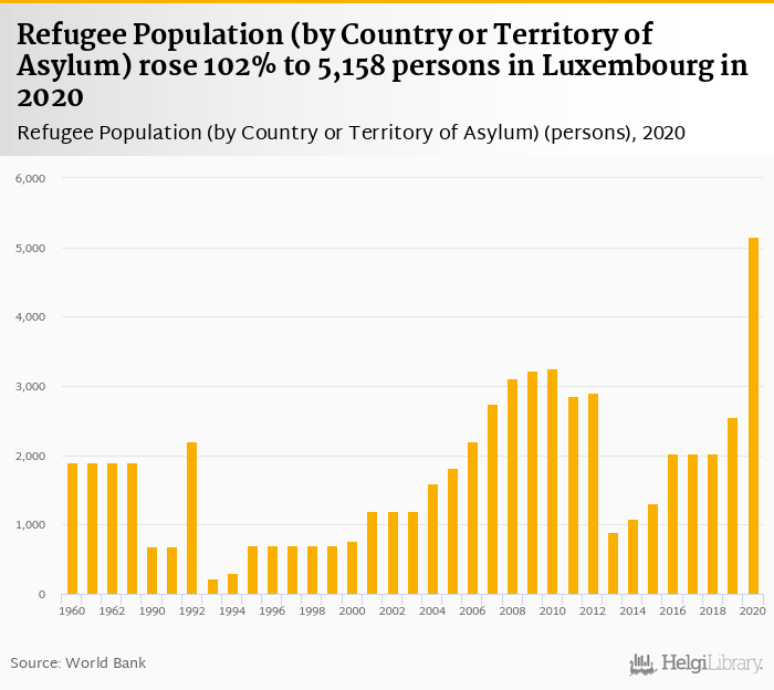 Refugee population by country or territory of asylum rose 102% to 5,158 persons in Luxembourg in 2020, according to the National Statistical Office.