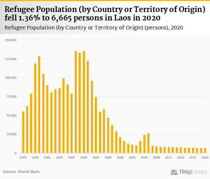 Historically, refugee population by country or territory of origin in Laos reached an all time high of 135,866 persons in 1988 and an all time low of 6,665 persons in 2020. When compared to Laos's main peers, refugee population by country or territory of origin in Cambodia amounted to 11,862 persons, 175,361 persons in China, 174 persons in Thailand and 316,728 persons in Vietnam in 2020.