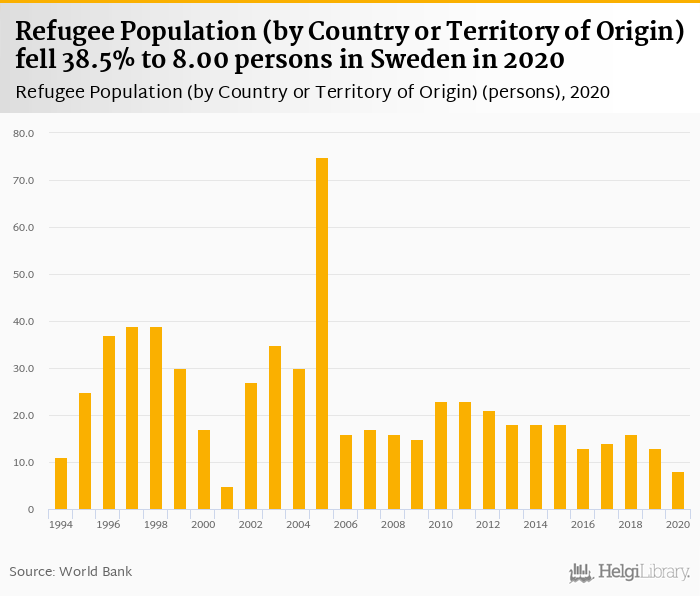 Refugee population by country or territory of origin fell 38.5% to 8.00 persons in Sweden in 2020, according to the National Statistical Office.