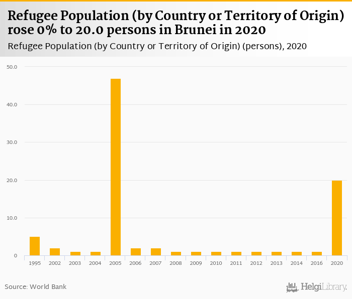 Refugee population by country or territory of origin rose 0% to 20.0 persons in Brunei in 2020, according to the National Statistical Office.