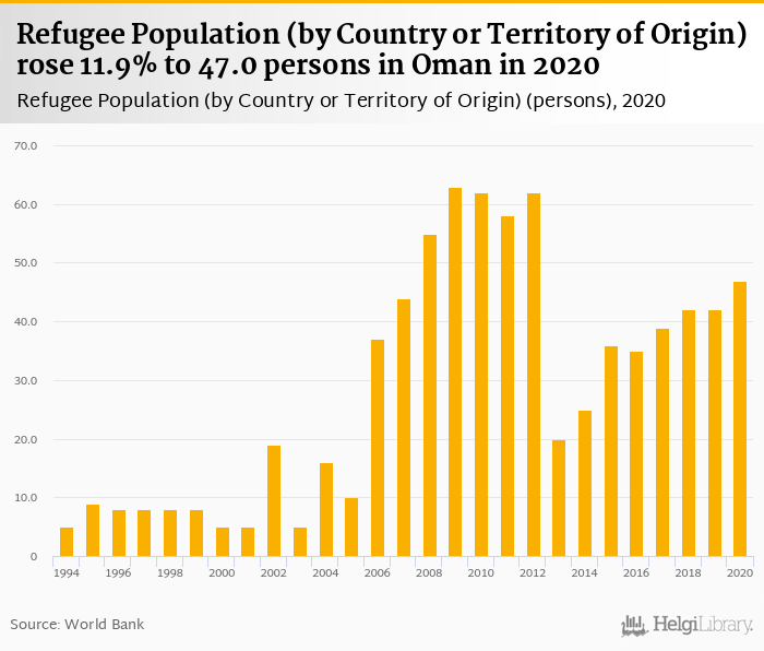 Refugee population by country or territory of origin rose 11.9% to 47.0 persons in Oman in 2020, according to the National Statistical Office.