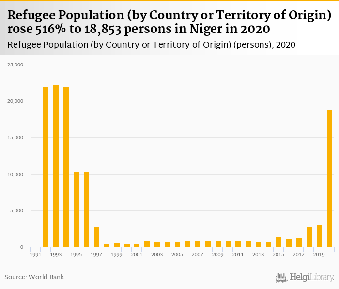 Refugee population by country or territory of origin rose 516% to 18,853 persons in Niger in 2020, according to the National Statistical Office.