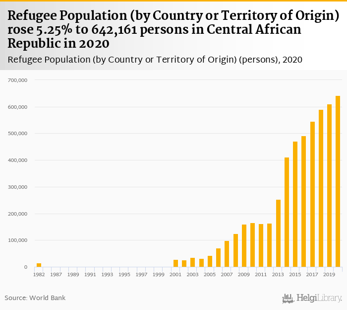 Refugee population by country or territory of origin rose 5.25% to 642,161 persons in Central African Republic in 2020, according to the National Statistical Office.