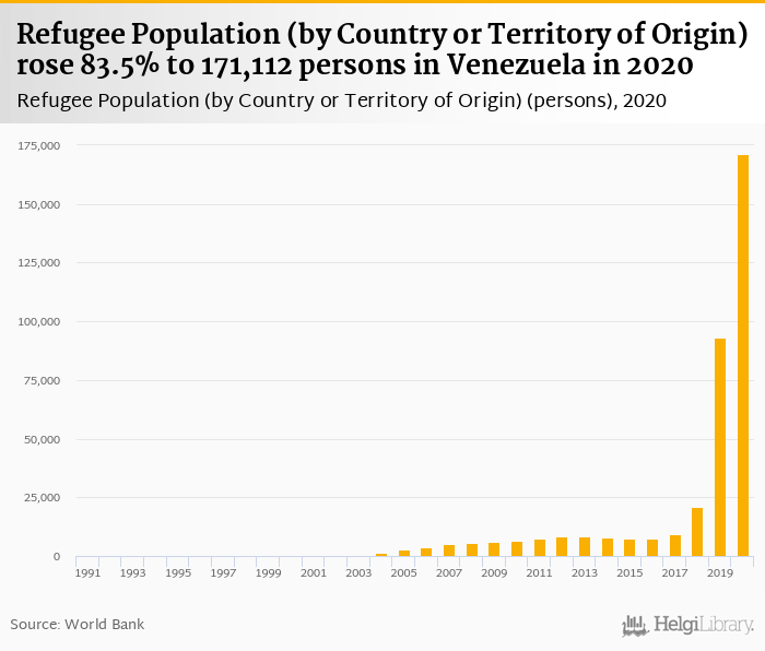 Refugee population by country or territory of origin rose 83.5% to 171,112 persons in Venezuela in 2020, according to the National Statistical Office.
