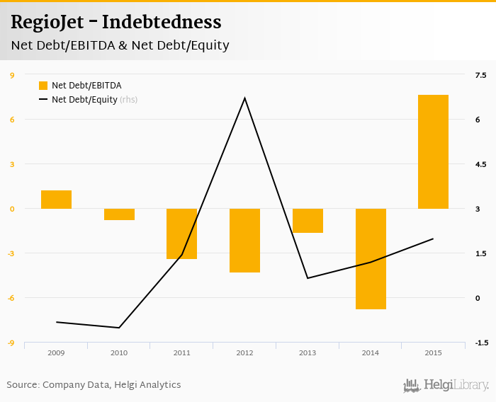 RegioJet's net debt stood at CZK 425 mil and accounted for 1.97 of equity at the end of 2015. The ratio is up 0.795 pp compared to the previous year.