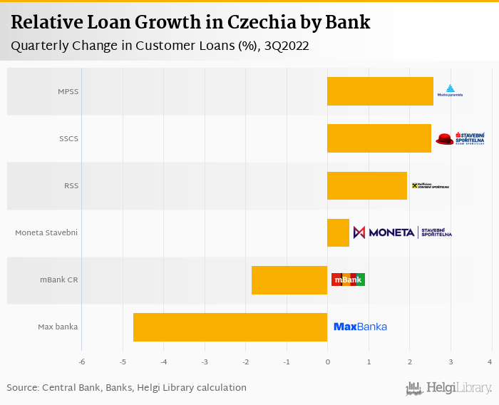 The comparison of 6 Czech banks shows Modra Pyramida Stavebni Sporitelna has grown the fastest in relative terms within the last quarter (2.59%% qoq), followed by Stavebni Sporitelna Ceske Sporitelny and Raiffeisen Stavebni Sporitelna. In absolute terms, however, Modra Pyramida Stavebni Sporitelna grabbed the largest piece of the pie when compared to the previous quarter (CZK 2,143 mil or 2.02% of the market net increase) followed by Stavebni Sporitelna Ceske Sporitelny and Raiffeisen Stavebni Sporitelna.