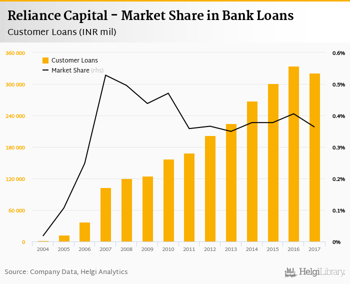 Reliance Capital accounted for 0.363% of all customer loans issued in India at the end of 2017. Historically, the bank’s market share in customer loans reached an all time high of 0.528% in 2007 and an all time low of 0.017% in 2004.
