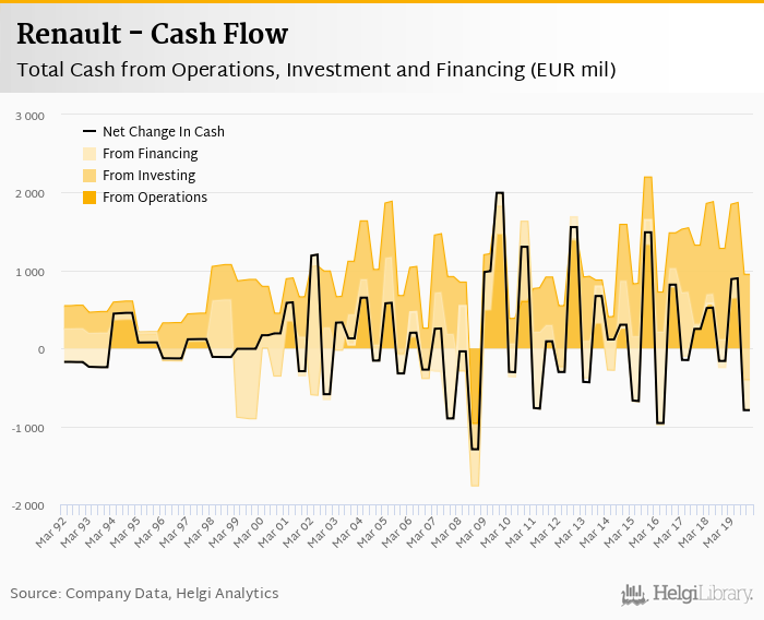 Renault's operating cash flow stood at EUR 945 mil in 4Q2019, down 26% when compared to the previous year. Historically, between 1Q1992 - 4Q2019, the firm’s operating cash flow reached a high of EUR 2,193 mil in 3Q2015 and a low of EUR -967 mil in 4Q2008.