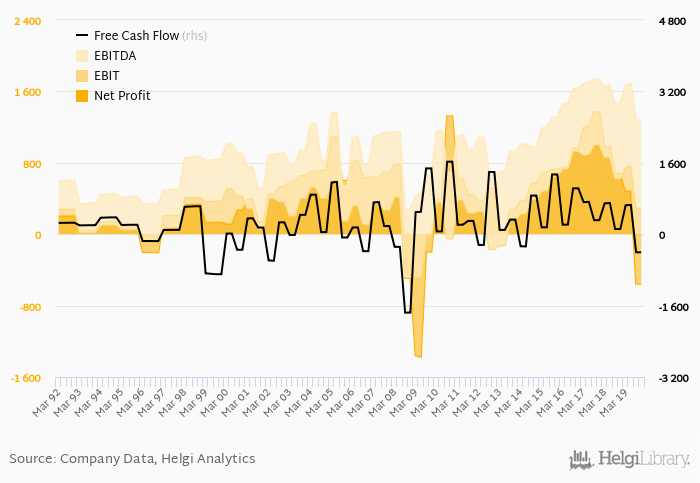 On the operating level, EBITDA reached EUR 1,279 mil, down 12.2% compared to the previous year. Over the last five years, the company's EBITDA has risen 5.63% a year on average.