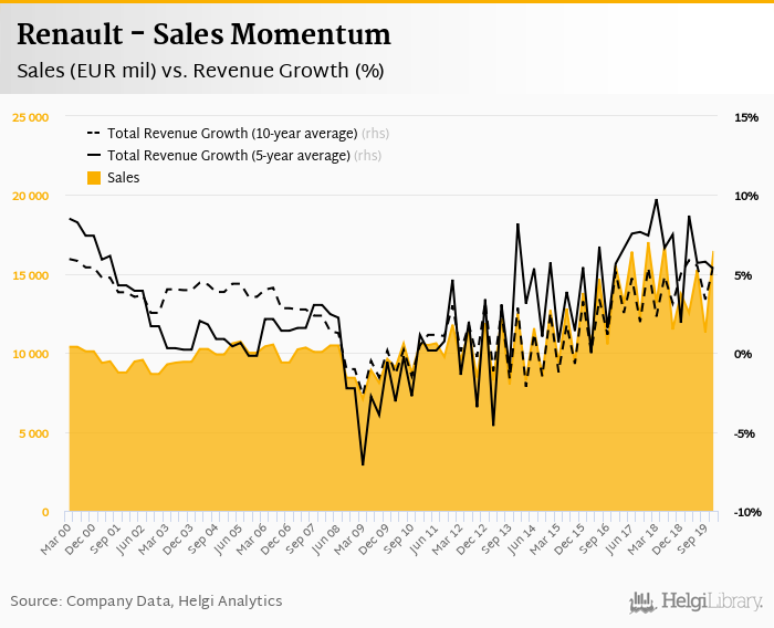 Renault generated sales of EUR 16,461 mil in 4Q2019, up 19.9% compared to the previous year. Historically, between 1Q1990 and 4Q2019, the company’s sales reached a high of EUR 17,015 mil in 4Q2017 and a low of EUR 5,830 mil in 1Q1990.