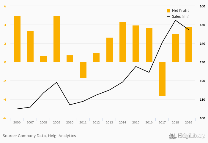 Historically, between 2006 and 2019, the company’s net profit reached a high of EUR 4.97 mil in 2009 and a low of EUR -3.66 mil in 2017. Over the last decade the firm's net profit decreased by an average of 2.75% a year.
