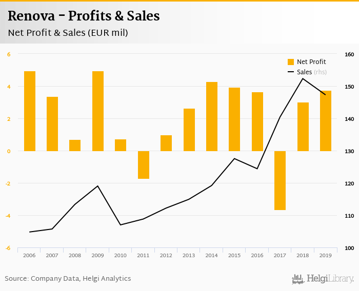 Renova made a net profit of EUR 3.76 mil in 2019, up 25.2% compared to the previous year. Total sales reached EUR 147 mil, which is down 3.31% when compared to the previous year.