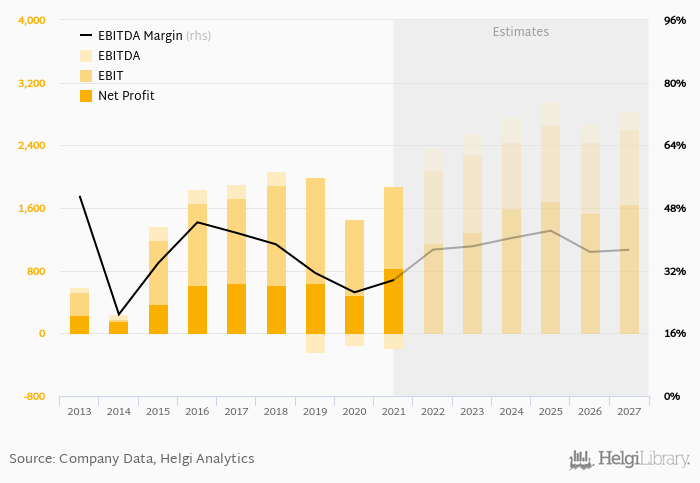 On the operating level, EBITDA reached USD 1,699 mil, up 29.2% compared to the previous year. Over the last five years, company's EBITDA has fallen 1.57% a year on average.