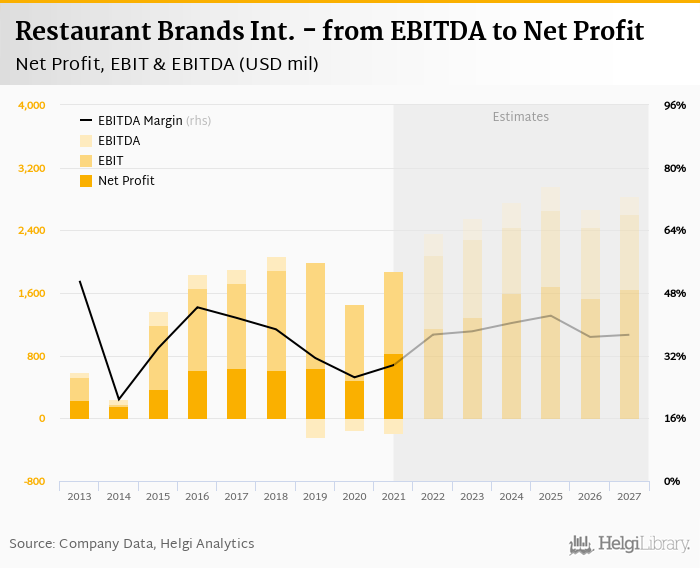 Restaurant Brands Int. made a net profit of USD 838 mil with revenues of USD 5,739 mil in 2021, up by 72.4% and up by 15.5%, respectively, compared to the previous year. This translates into a net margin of 14.6%.