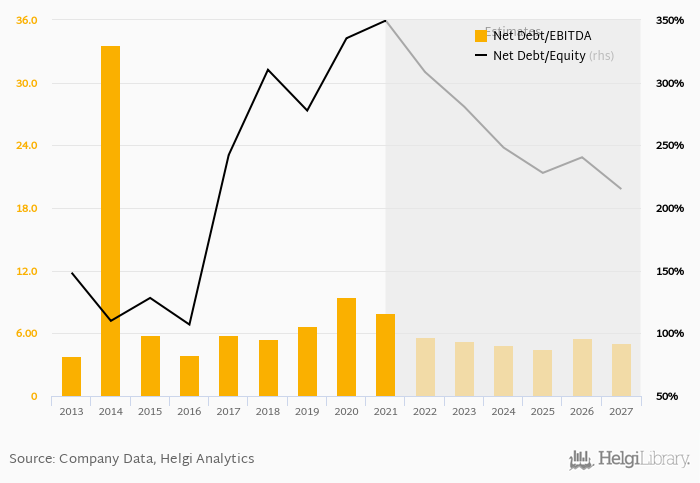Historically, the firm’s net debt to equity reached a high of 350% in 2021 and a low of 107% in 2016 between 2013 and 2021. The average for the last five years was 303%.