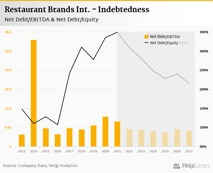 Restaurant Brands Int.'s net debt stood at USD 13,468 mil and accounted for 350% of equity at the end of 2021. The ratio is up 14.1 pp compared to the previous year.