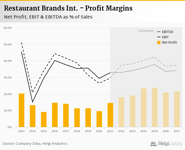 Restaurant Brands Int. made a net profit of USD 838 mil with revenues of USD 5,739 mil in 2021, up by 72.4% and up by 15.5%, respectively, compared to the previous year.