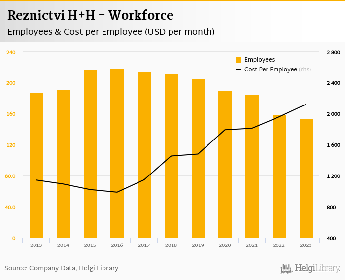 Reznictvi H+H employed 154 employees in 2023, down 3.14% compared to the previous year. Historically, between 2013 and 2023, the firm's workforce hit a high of 219 employees in 2016 and a low of 154 employees in 2023.