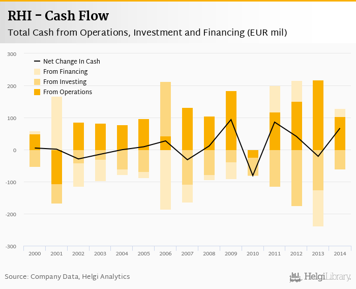 RHI's operating cash flow stood at EUR 103 mil in 2014, down 52.3% when compared to the previous year. Historically, between 2000 - 2014, the firm’s operating cash flow reached a high of EUR 217 mil in 2013 and a low of EUR -107 mil in 2001.
