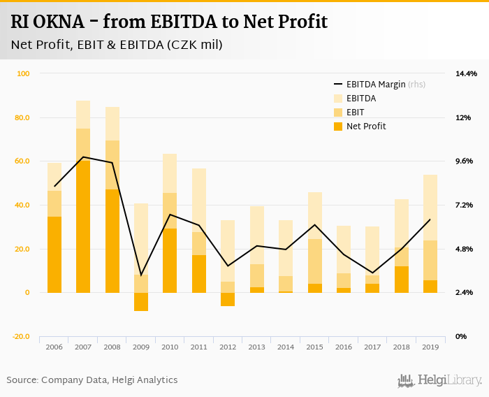 RI OKNA made a net profit of CZK 6.00 mil with revenues of CZK 843 mil in 2019, down by 50.7% and down by 6.01%, respectively, compared to the previous year. This translates into a net margin of 0.712%.