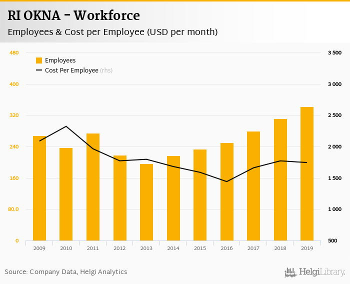 RI OKNA employed 342 employees in 2019, up 9.62% compared to the previous year. Historically, between 2009 and 2019, the firm's workforce hit a high of 342 employees in 2019 and a low of 197 employees in 2013.