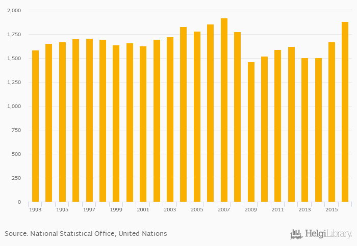 Road goods transported in million of tonnes rose 13.0% to 1,885 Mt in the United Kingdom in 2016, according to the National Statistical Office.