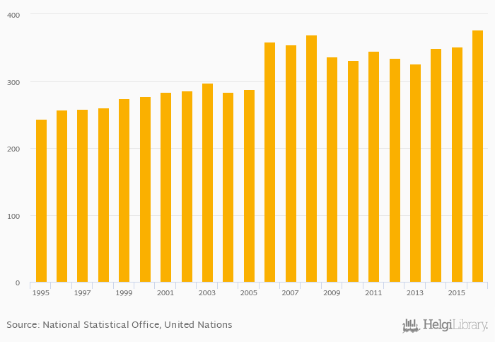 Road goods transported in million of tonnes rose 7.22% to 376 Mt in Austria in 2016, according to the National Statistical Office.