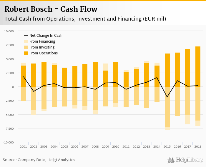 Robert Bosch's operating cash flow stood at EUR 7,267 mil in 2018, up 6.88% when compared to the previous year. Historically, between 2001 - 2018, the firm’s operating cash flow reached a high of EUR 7,267 mil in 2018 and a low of EUR 2,717 mil in 2011.