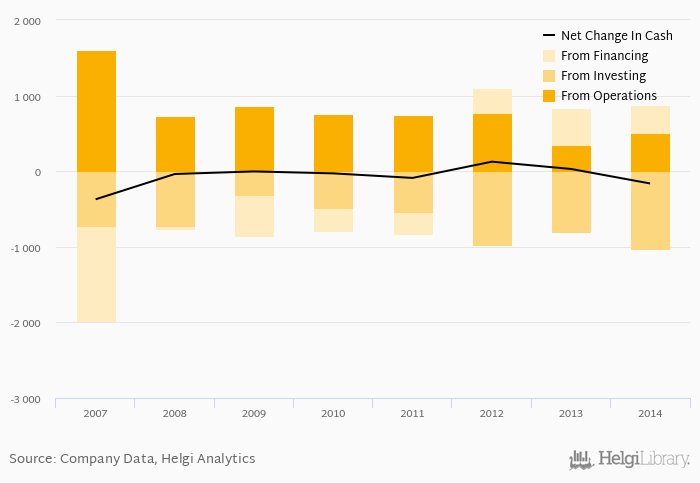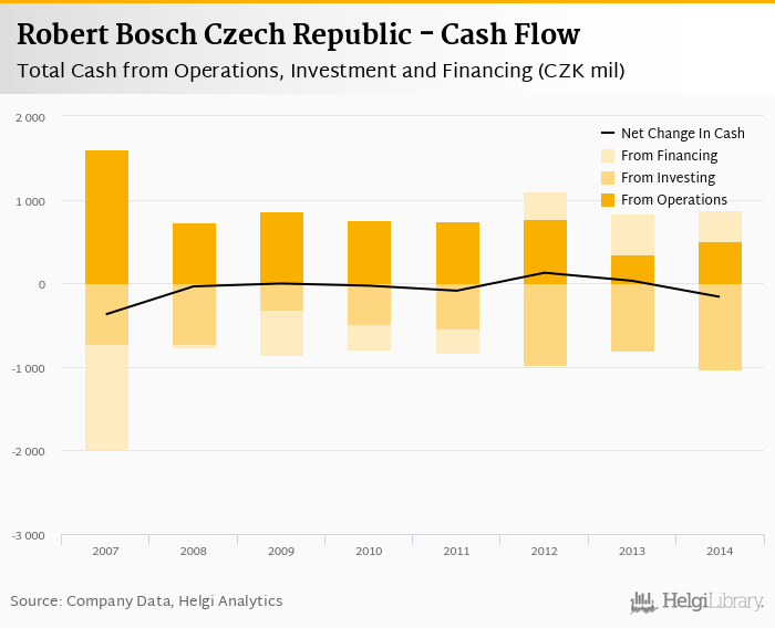Cash from financing amounted to CZK 366 mil, so the company generated CZK -163 mil net cash in 2014.