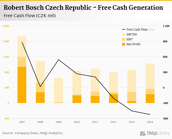 The company generated cash, defined by a sum of net profit and depreciation, of CZK 881 mil or 6.03% of sales. When investments are excluded, free cash flow reached CZK -529 mil, or -3.62% of sales in 2014.