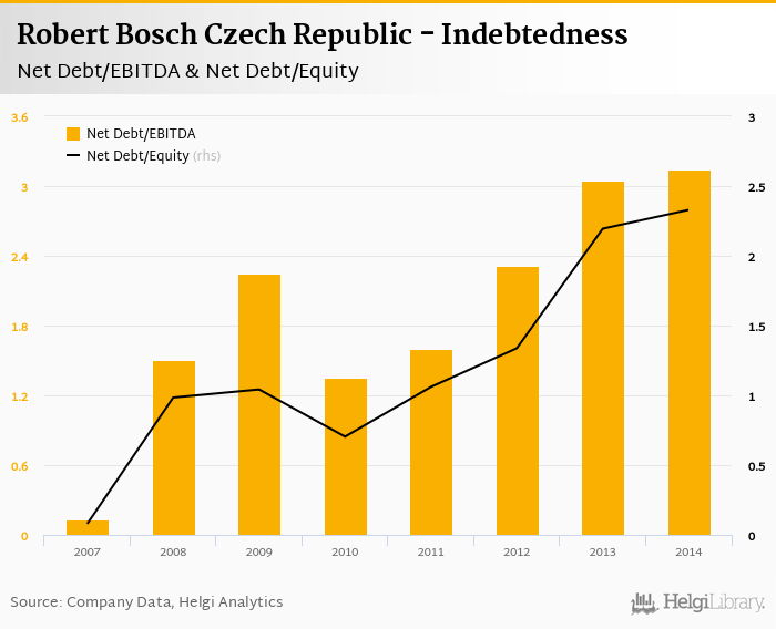 Robert Bosch Czech Republic's net debt stood at CZK 3,207 mil and accounted for 2.33 of equity at the end of 2014. The ratio is up 0.135 pp compared to the previous year.