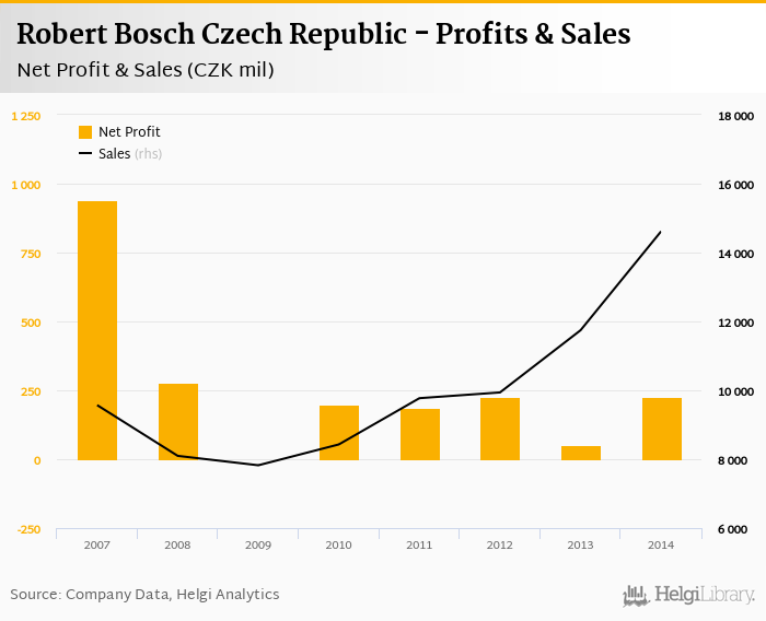 Robert Bosch Czech Republic made a net profit of CZK 228 mil in 2014, up 352% compared to the previous year. Total sales reached CZK 14,617 mil, which is up 24.5% when compared to the previous year.