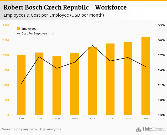 Robert Bosch Czech Republic employed 2,607 employees in 2014, up 6.89% compared to the previous year. Historically, between 2007 and 2014, the firm's workforce hit a high of 2,607 employees in 2014 and a low of 1,968 employees in 2009.