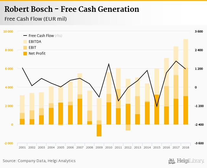 Robert Bosch made a net profit of EUR 3,047 mil with revenues of EUR 78,465 mil in 2018, up by 9.88% and up by 0.511%, respectively, compared to the previous year. This translates into a net margin of 3.88%.