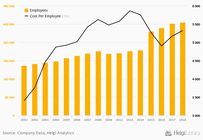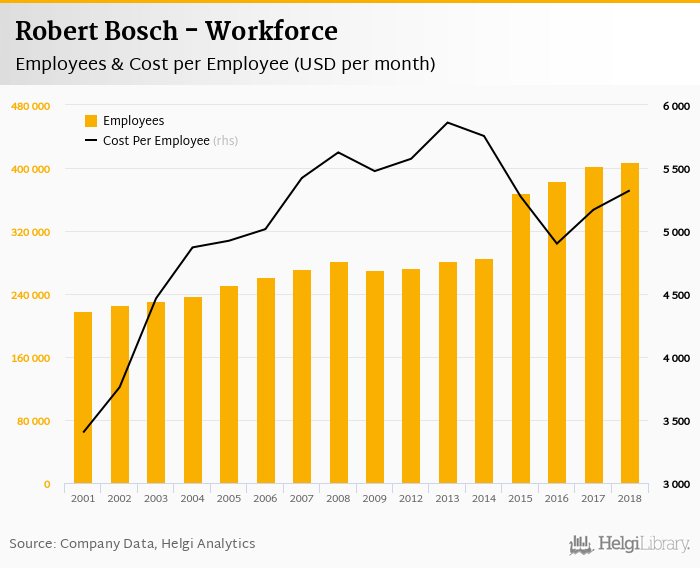 Robert Bosch employed 407,485 employees in 2018, up 1.21% compared to the previous year. Historically, between 2001 and 2018, the firm's workforce hit a high of 407,485 employees in 2018 and a low of 218,377 employees in 2001.