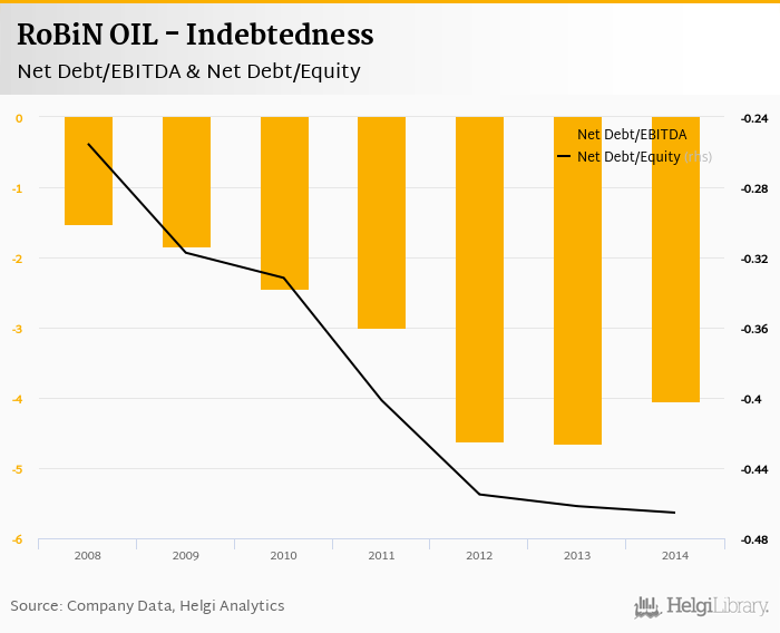 RoBiN OIL's net debt stood at CZK -696 mil and accounted for -0.465 of equity at the end of 2014. The ratio is down 0.004 pp compared to the previous year.