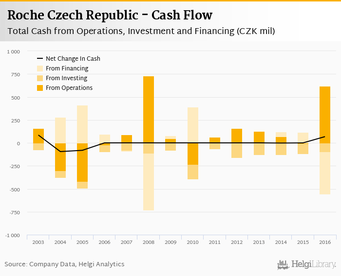 Cash from financing amounted to CZK -458 mil, so the company generated CZK 68.3 mil net cash in 2016.