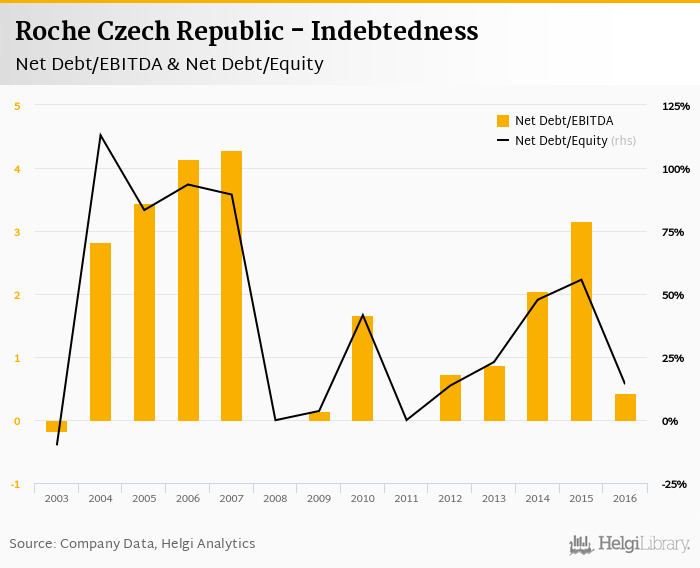 Roche Czech Republic's net debt stood at CZK 203 mil and accounted for 14.2% of equity at the end of 2016. The ratio is down 41.5 pp compared to the previous year.