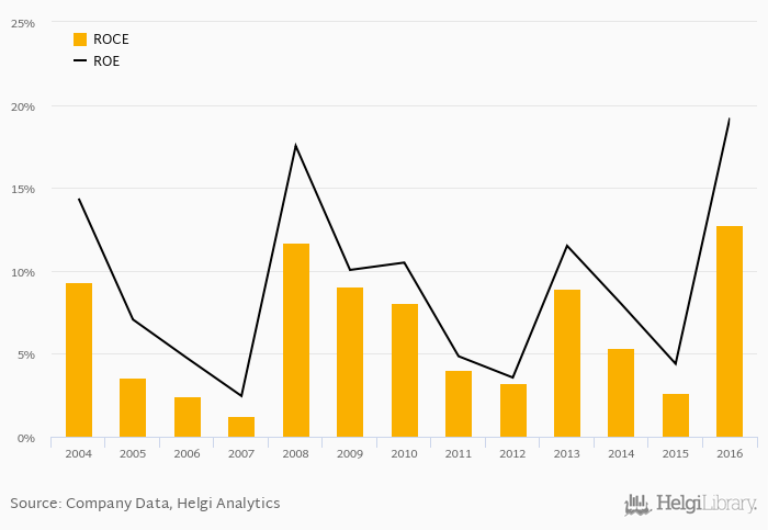 The result implies a return on equity of 19.2% and a return on invested capital of 12.8% in 2016. That is compared to an average of 9.34% and 6.60% over the last five years.