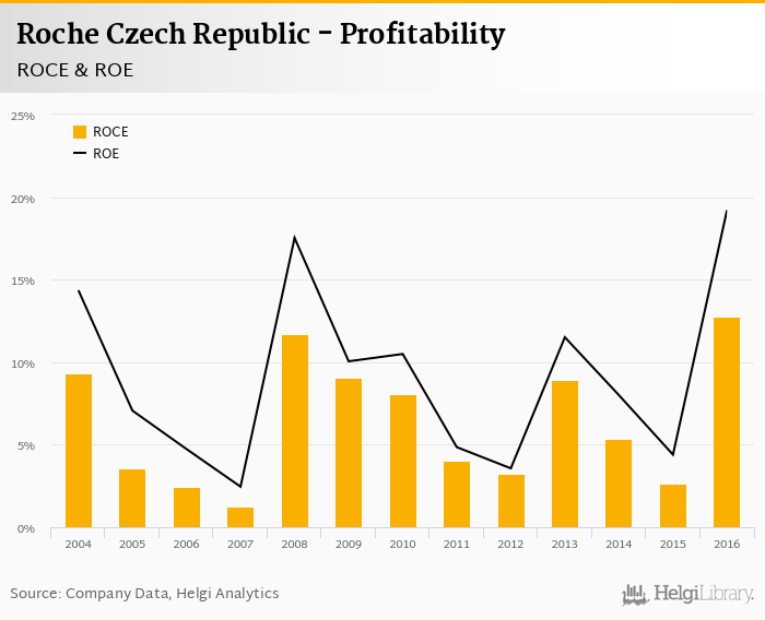 As far as Roche Czech Republic's peers are concerned, Pfizer Czech Republic generated ROE of 6.03% and ROCE of 5.37% in 2016. Bayer Czech Republic's profitability reached 57.6% and 23.1%, respectively. Amgen Czech Republic operated with 15.9% and 17.9% returns in 2016.