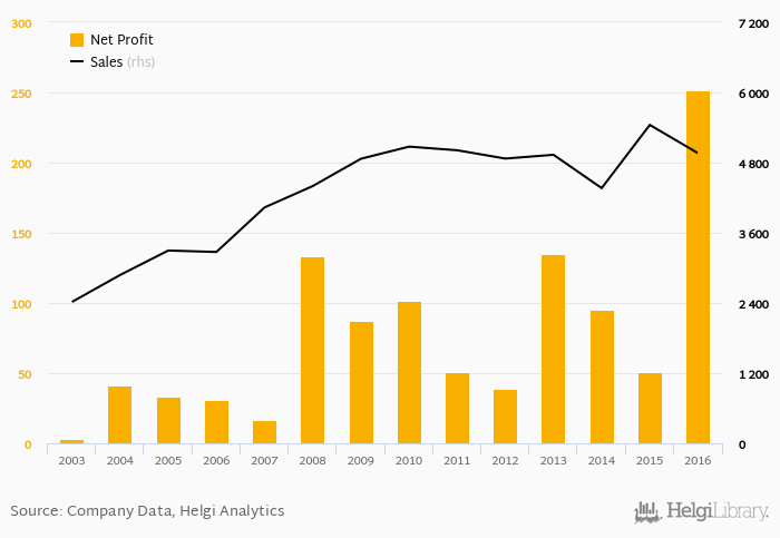 Sales have grown by 4.25% a year on average since 2006. They reached a high of CZK 5,445 mil in 2015 and a low of CZK 2,418 mil in 2003.