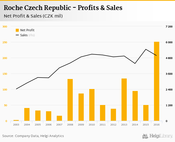 Roche Czech Republic made a net profit of CZK 252 mil in 2016, up 394% compared to the previous year. Total sales reached CZK 4,962 mil, which is down 8.88% when compared to the previous year.