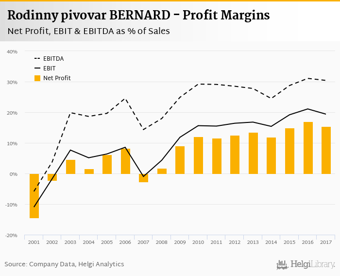Rodinny pivovar BERNARD made a net profit of CZK 104 mil with revenues of CZK 672 mil in 2017, down by 4.67% and up by 4.63%, respectively, compared to the previous year.