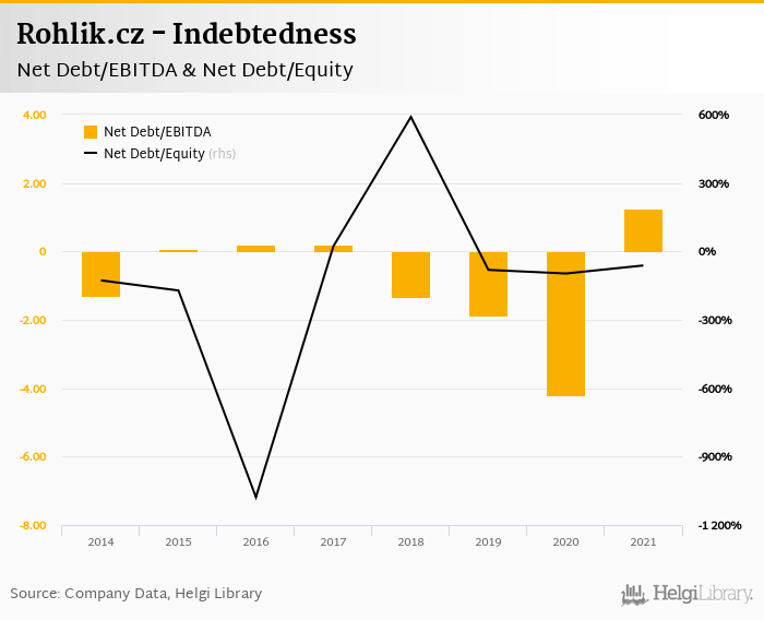 Rohlik.cz's net debt stood at CZK -92.2 mil and accounted for -61.6% of equity at the end of 2021. The ratio is up 35.3 pp compared to the previous year.