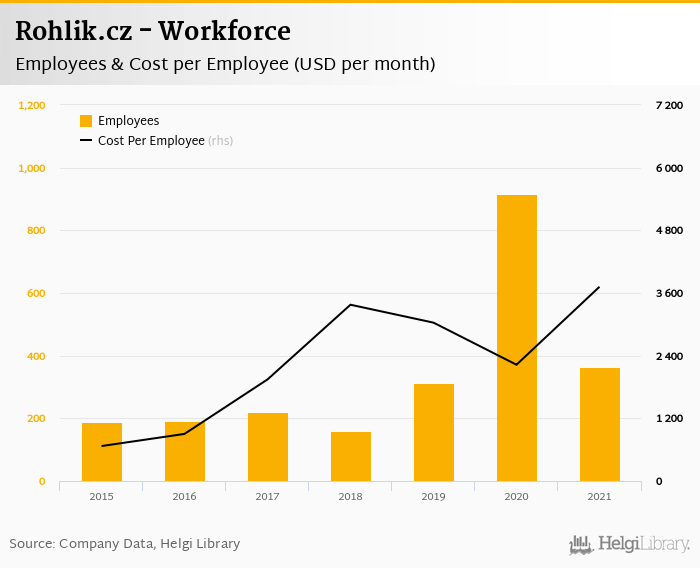 Rohlik.cz employed 364 employees in 2021, down 60.3% compared to the previous year. Historically, between 2015 and 2021, the firm's workforce hit a high of 916 employees in 2020 and a low of 161 employees in 2018.