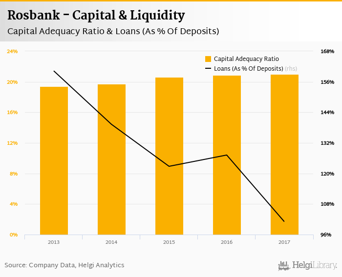 Comparing Rosbank with its closest peers, Sberbank ended the year 2017 with a capital adequacy ratio at 13.0% and loans to deposits of 93.3%, VTB Bank with 14.8% and 100% respectively and Alfa Bank some 17.4% in terms of capital adequacy and 93.9% of loans to deposits at the end of 2017.